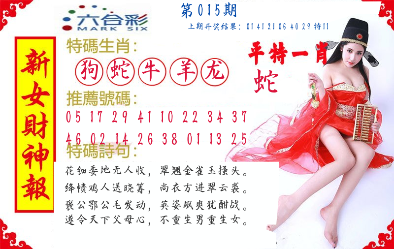 | 010期推荐五肖: 狗羊牛蛇鸡 ~~稳准狠 |